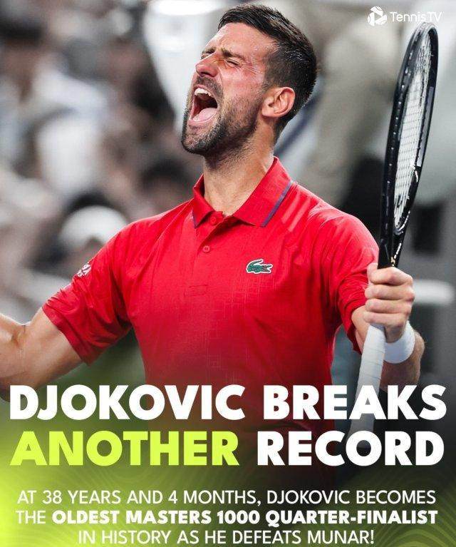 北京时间10月7日,在ATP1000上海大师赛男单第四轮中,德约科维奇以6比3、5比7和6比2,大比分2比1战胜了穆纳尔,第11次杀入上海大师赛8强。这不仅是德约的第97个大师赛八强,同时他也以38岁4个月的年龄超越费德勒的38岁2个月,成为历史上打进大师赛男单八强最年长的球员。德约的下轮对手将是贝尔赫斯。