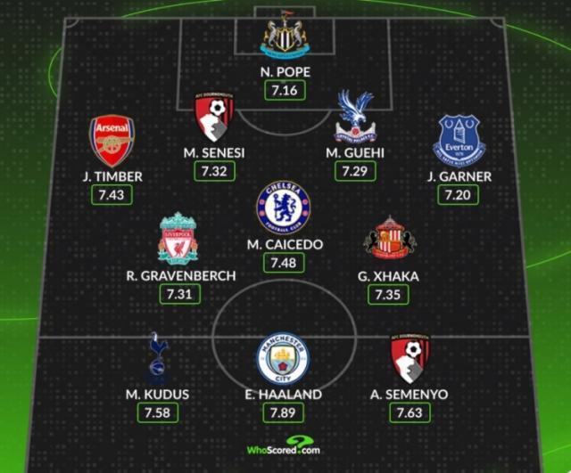 WhoScored英超开赛以来最佳阵:哈兰德、凯塞多、扎卡、廷伯在列